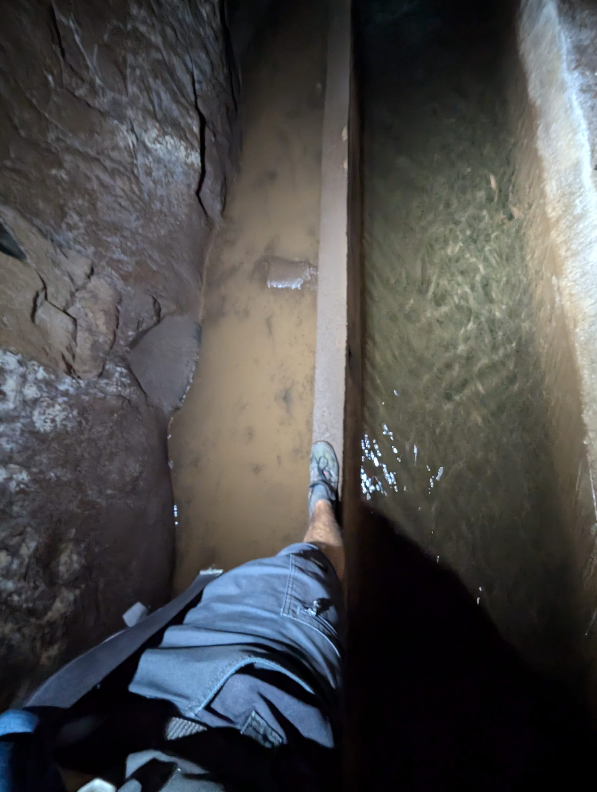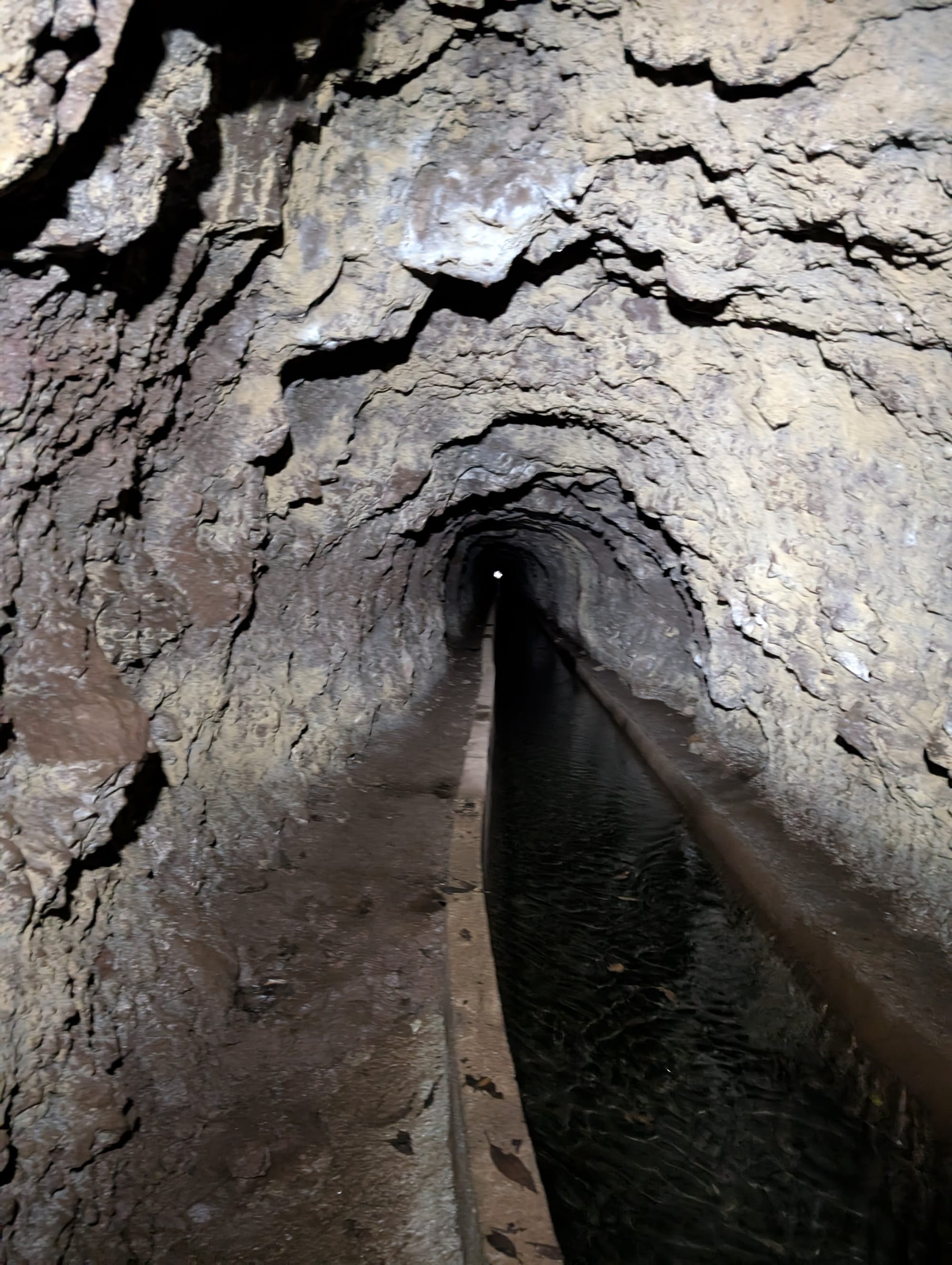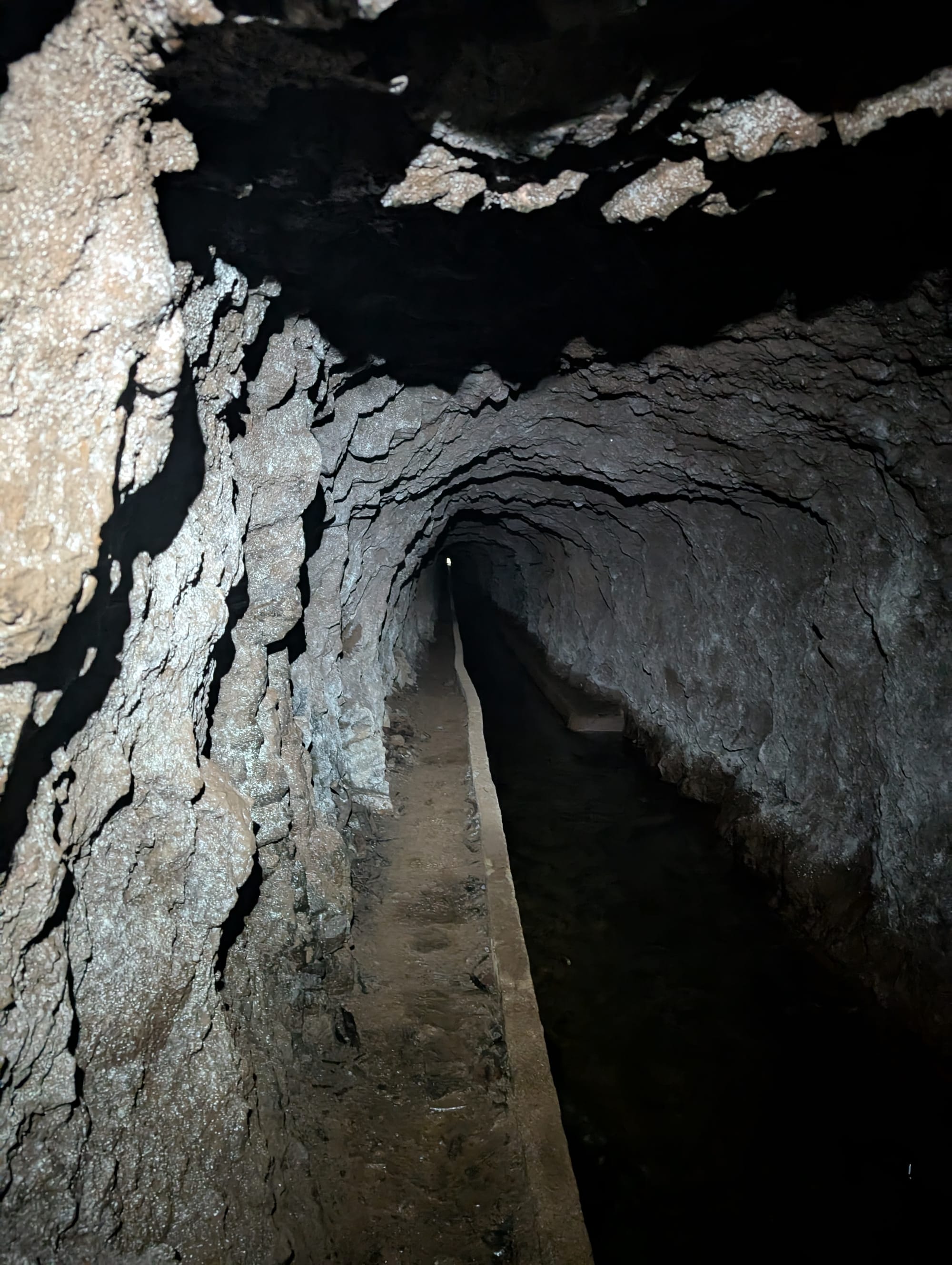 In der Mitte des Tunnels kommt das Grundwasser aus Spalten in der Tunneldecke und den Wänden und ich wurde ordentlich nass.
