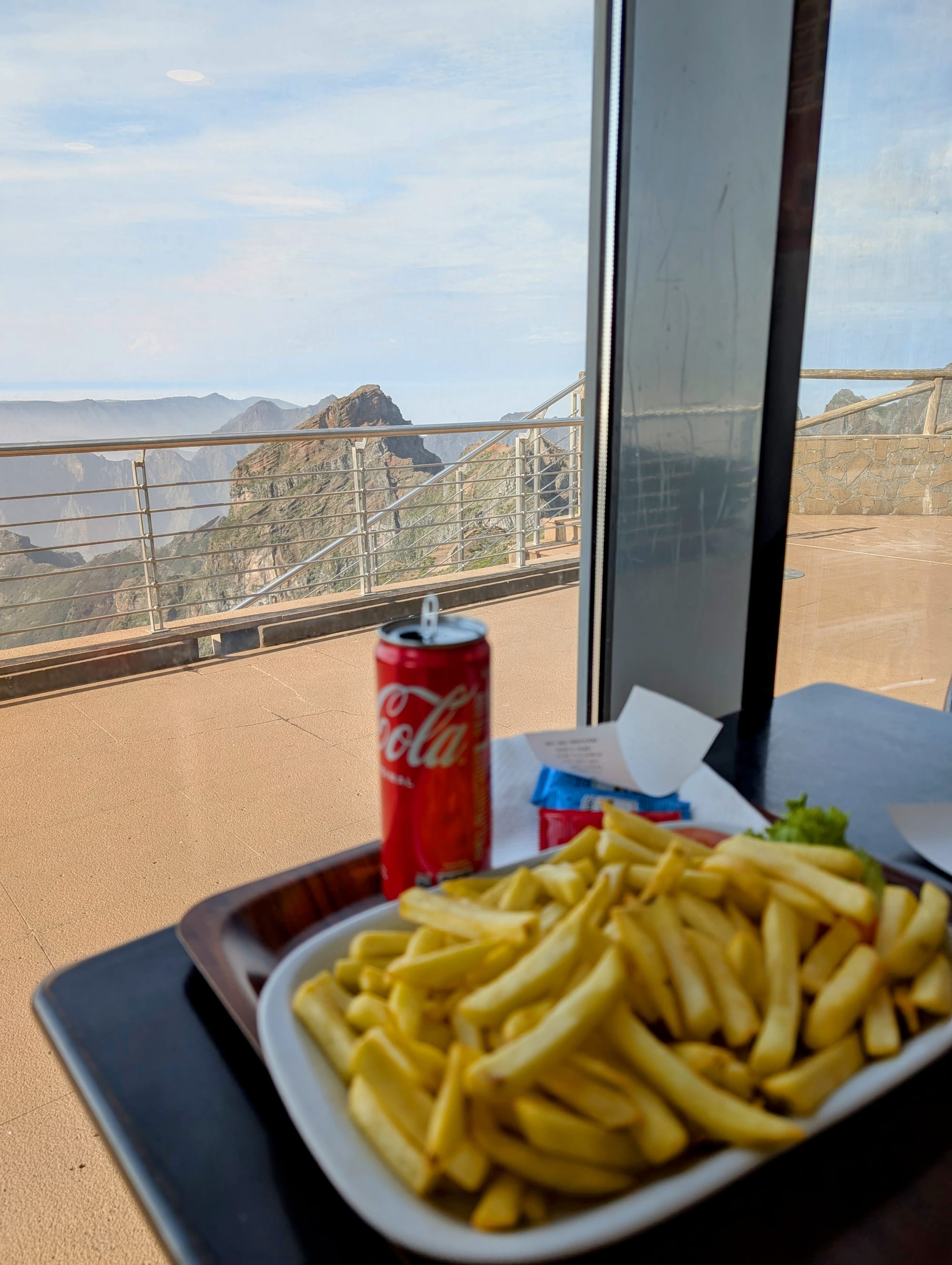 Das kleine Restaurant kam mir sehr gelegen. Hier nahm ich die erste warme Mahlzeit meiner Tour zu mir: Eine riesige, günstige, aber leider nicht besonders gute Portion Pommes. Aus dem Restaurant hatte ich schöne Aussicht auf den Pico Ruivo.